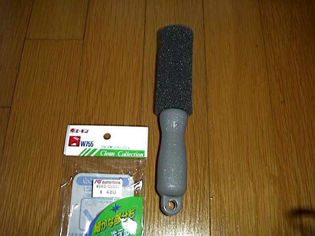 ナビも届いたし、接続説明書も熟読したし、取り付けに必要なものもだいたいわかったので、オートテック用賀へ買い物にいきました。購入したナビ(SONY NVX-FW1)は、シガーライター電源から電源を取れるよう(というか、強制的にシガーライター電源からしか取れないような構成)になっています。まぁ、それも、簡単に取り付けできるという「売り」の一つなんですが、車内の見えるところに配線が見えてしまい、それではあまりにウツクシクない。そこで、シガーライター裏の配線か、オーディオ裏のACC電源から電源を取れるよう、配線コネクターやら、配線コードを買ってきました。ついでに配線をまとめるために配線チューブなど。本当は、ナビ付属の TV 用アンテナが車外に付けなければいけないものだったので、車内の窓に張りつけられるものをと思って探したのですが、イメージに合うものが無く、諦めました。とりあえず、最初は付属のアンテナで我慢しようと思います。まぁ、これらはいづれナビ取り付けをした時にモディファイのページで説明するつもりなので置いといて、今日の本題はこれです。エーモンのホイール洗車ブラシ。これ、単にプラスティックの柄の先に、固い棒のまわりにスポンジが巻き付けてあるだけのものなんですが、非常に使いやすいです。今まで、ホイール用のブラシと言えば、針金の周りに毛先の固いナイロンブラシが付いているようなものしかなかったんですが、これだと持ちやすく、スポンジでやさしく洗えます。