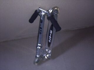 という乗り物、早速壊してしまいました。飲み会帰りに乗ろうと、折りたたんであるハンドルを引っ張ったところ、スポーン...て。抜けてしまったんです。六角レンチを買ってきて修理したんですが、どうも無理にハンドルを差し込んだりしているうちに、ハンドルのパイプに傷が付いてしまったらしく、ハンドルの抜き差しのすべりが悪くなってしまいました。まー、一応たためるし、乗る機能上問題ないので良しとしときますか。